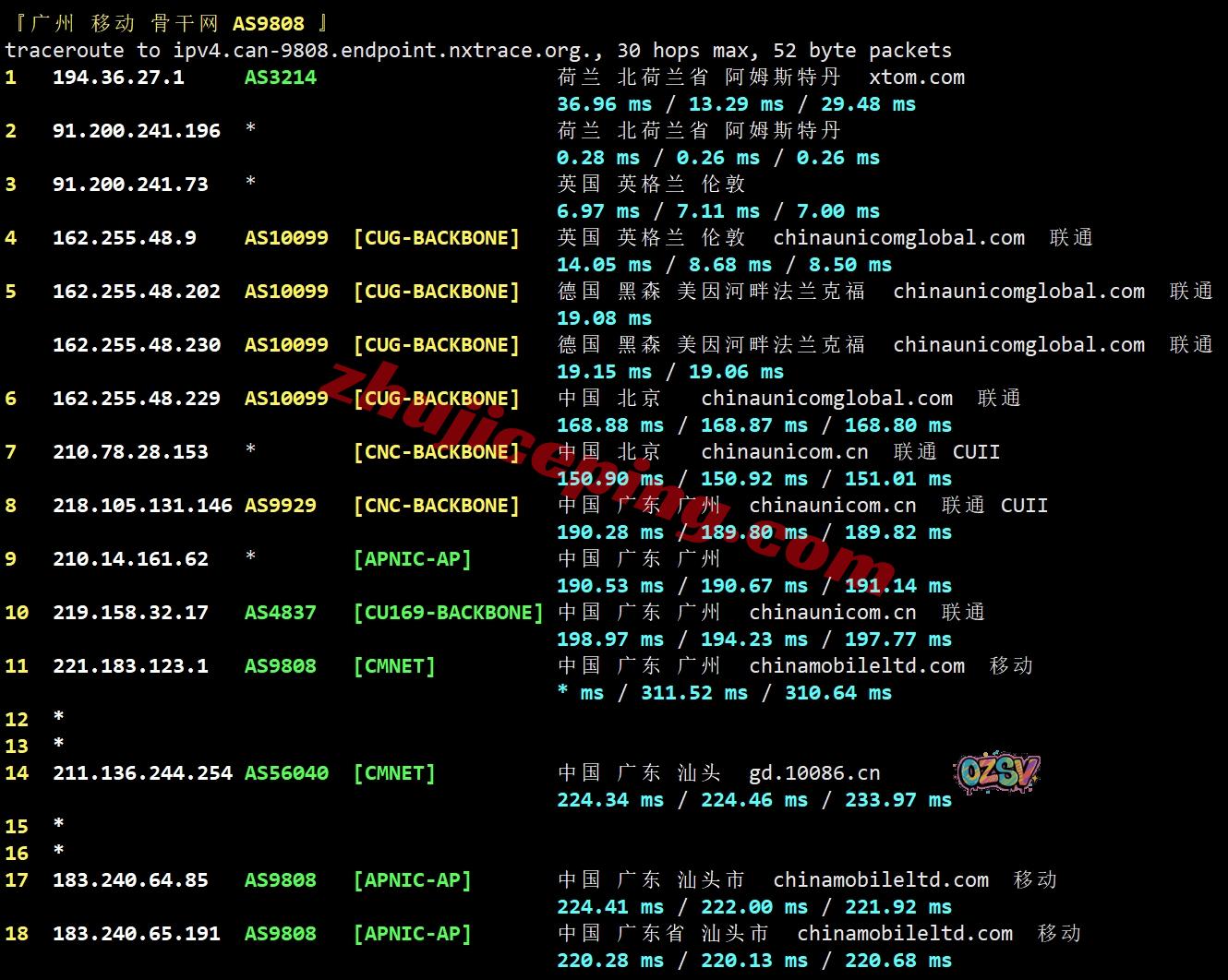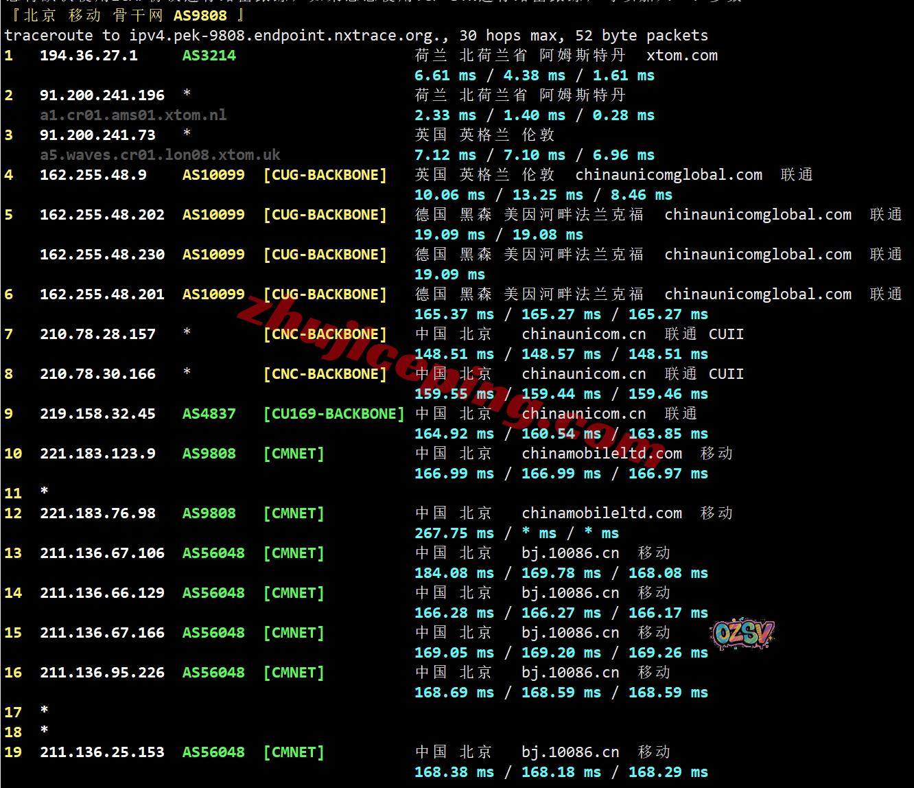 移动回程:走联通AS10099经过英国、德国然后接AS9929/CUII回国