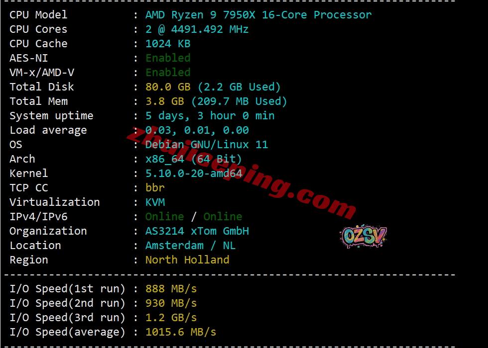VDS用的CPU型号为Ryzen 9 7950X(16核、32线程、主频4.5GHz、加速频率5.7GHz),站长启用了BBR,支持IPv6,XTOM的网络,归属地荷兰阿姆斯特丹,当前I/O大致1015MB/S: