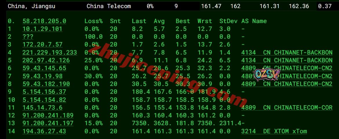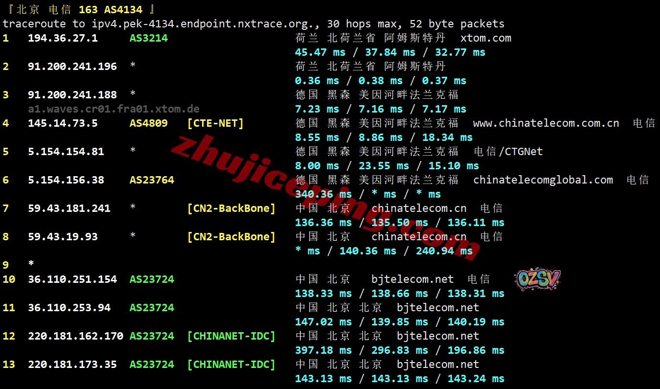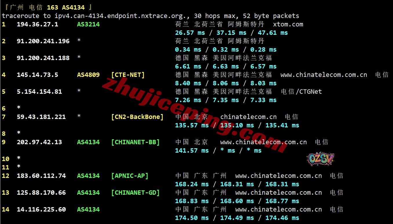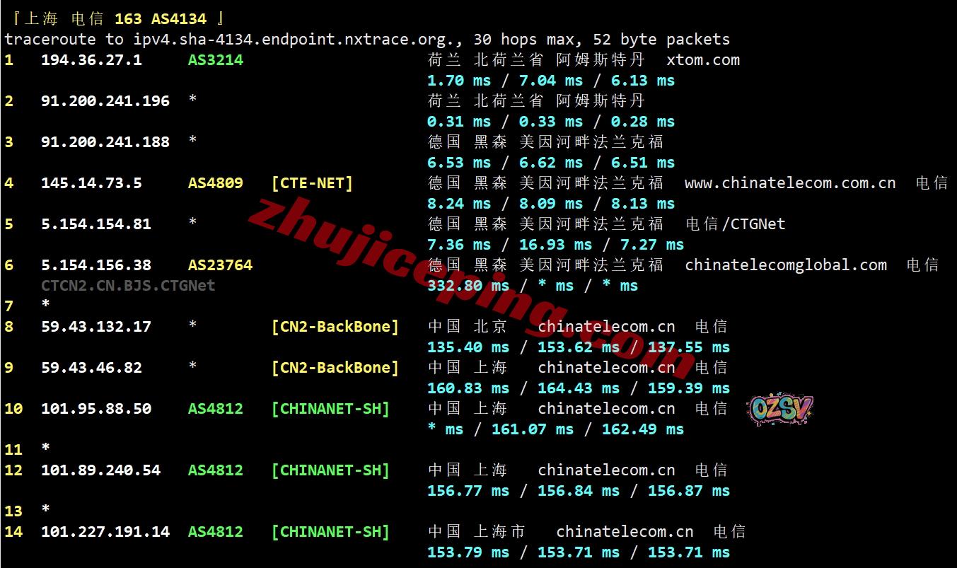 电信回程:走电信CTG先到德国法兰克福然后直连出海,然后接CN2回国