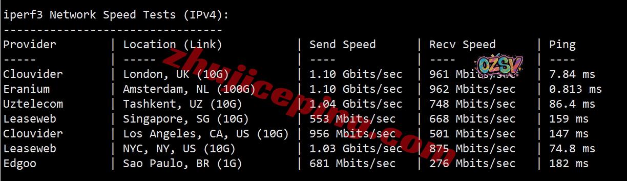 iperf3,几个国际节点的测试数据: