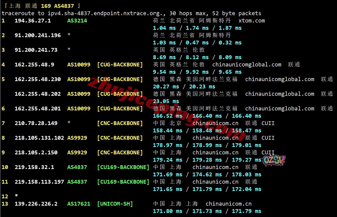 联通回程:走联通AS10099经过英国、德国然后接AS9929/CUII