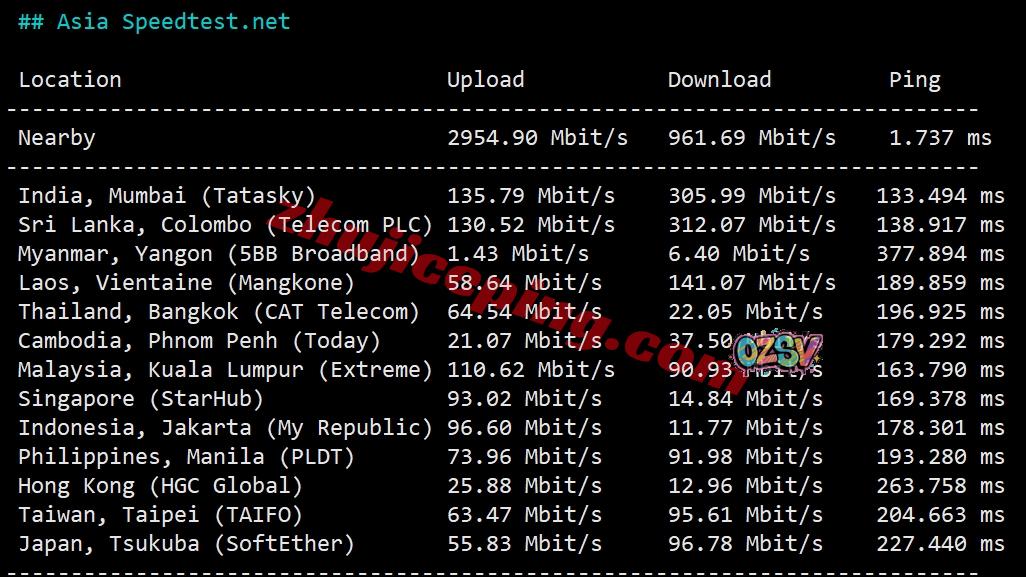 speedtest的部分亚洲节点的测试数据: