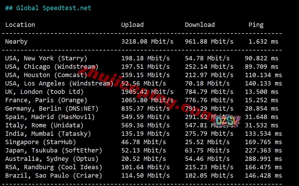 speedtest.net的部分国际节点测试效果: