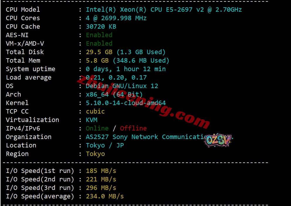 CPU采用e5-2697v2(双路e5-2697v2,24核、48线程、主频2.7GHz、加速频率3.5GHz),不支持IPv6,上游网络为索尼网络通讯,归属地日本东京,当前I/O大致234MB/S:
