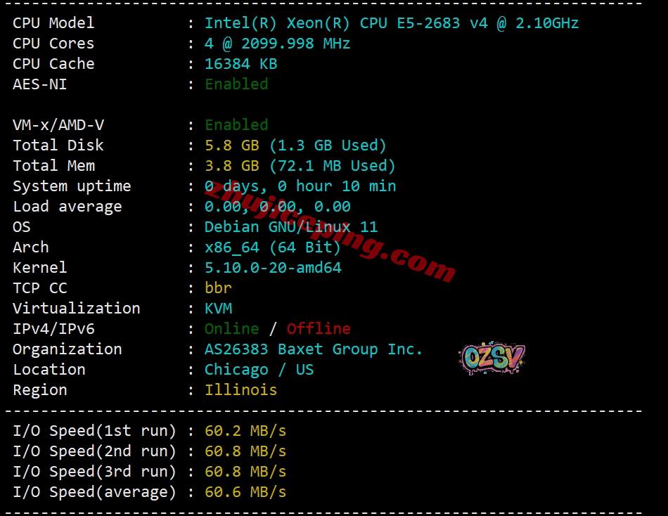 e5-2683v4(一般双路,32核、64线程、主频2.1GHz、加速频率3.0GHz),站长启用了BBR,不支持IPv6,归属地芝加哥,当前硬盘I/O大致60MB/S(商家限制了):