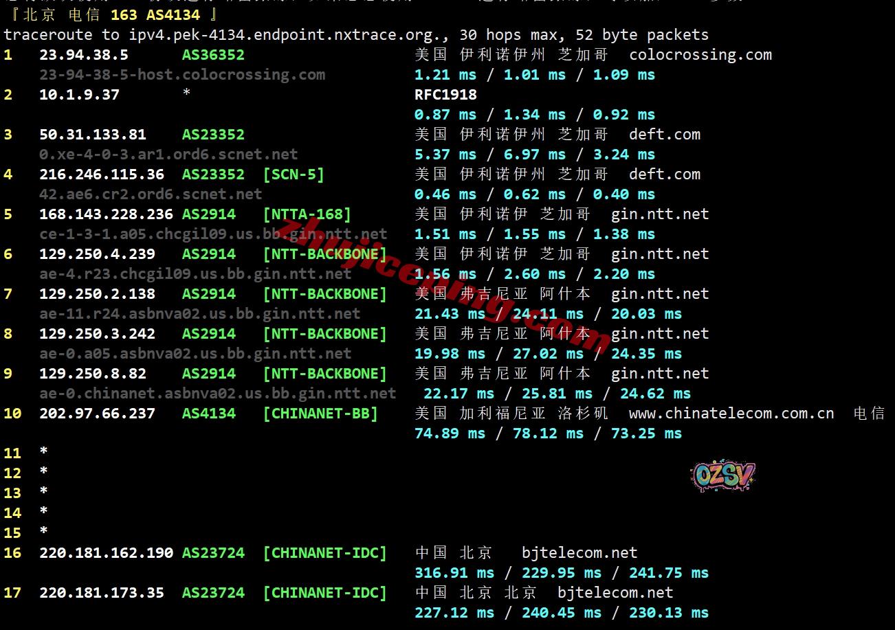 电信回程:走NTT先去阿什本然后到洛杉矶,然后从电信洛杉矶/圣何塞节点直连回国