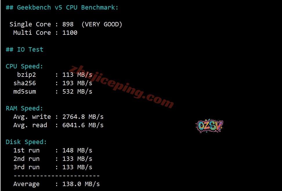 CPU采用的是Intel Xeon Platinum,主频2.5GHz,盲猜可能是8180(28核、56线程)… AS显示是阿里云,归属地新加坡,大致I/O 138MB/S。如果你看过主机测评之前关于claw.cloud的其他数据中心的云服务器的测评大致就发现了几乎所有服务器的配置都是一样的,都是阿里云的…