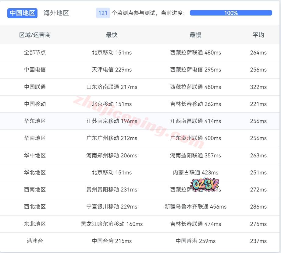国内三网多节点的延迟数据:
