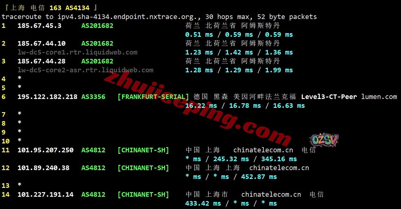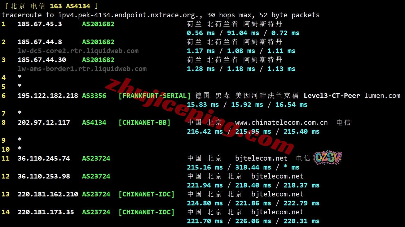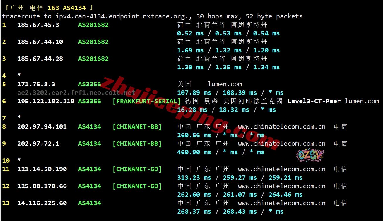 电信去程:直连电信美国圣何塞节点,然后走cogent去了加拿大魁北克再去英国、荷兰