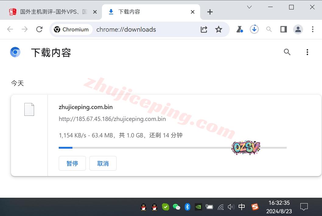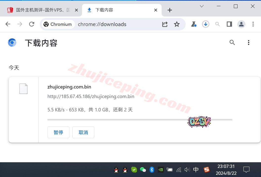存放在测试VPS上的文件,广州联通家宽直接用浏览器下载该文件,大致的下载速度如下: