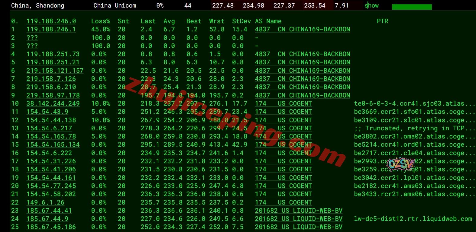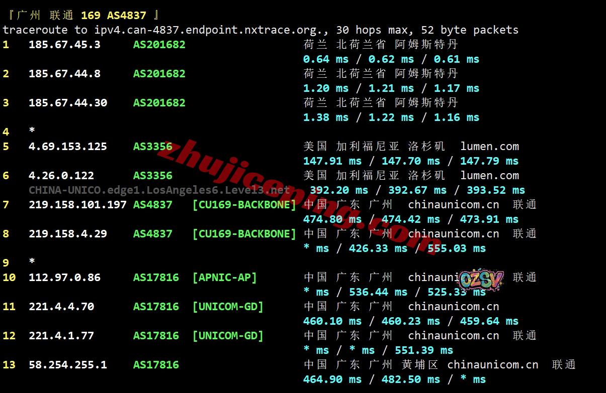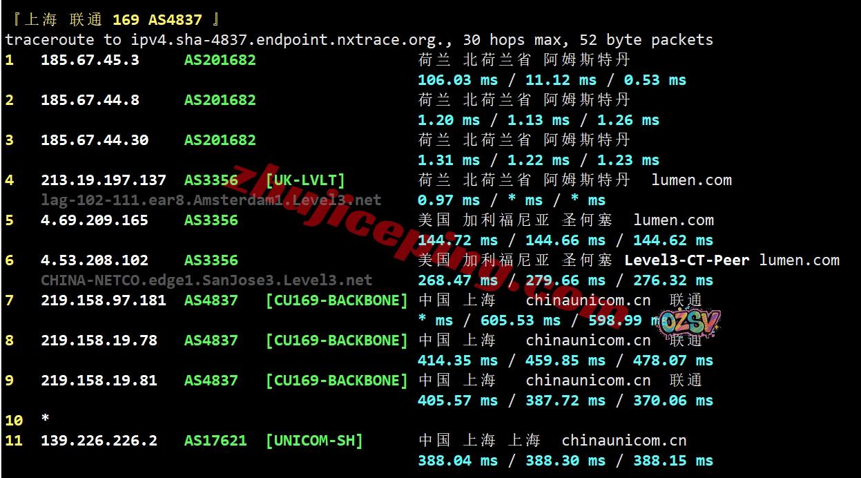 联通去程:直连联通美国圣何塞,然后接cogent去加拿大魁北克,再去英国、荷兰