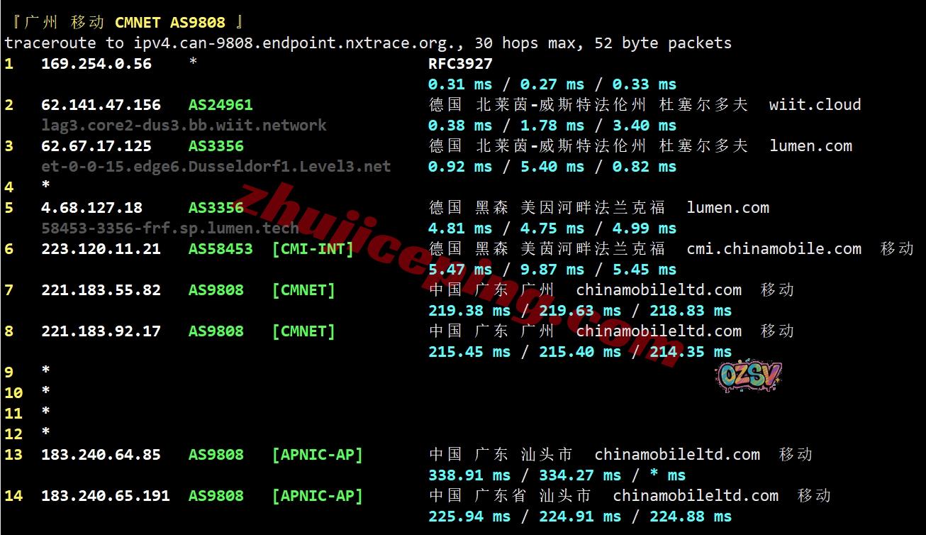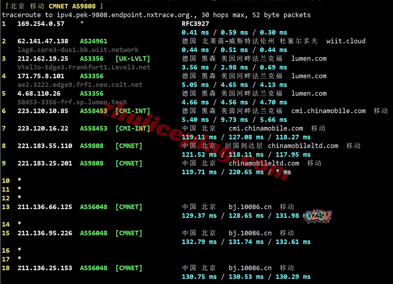 北京/广州方向:WIIT接lumen到法兰克福,从移动法兰克福节点直连回国