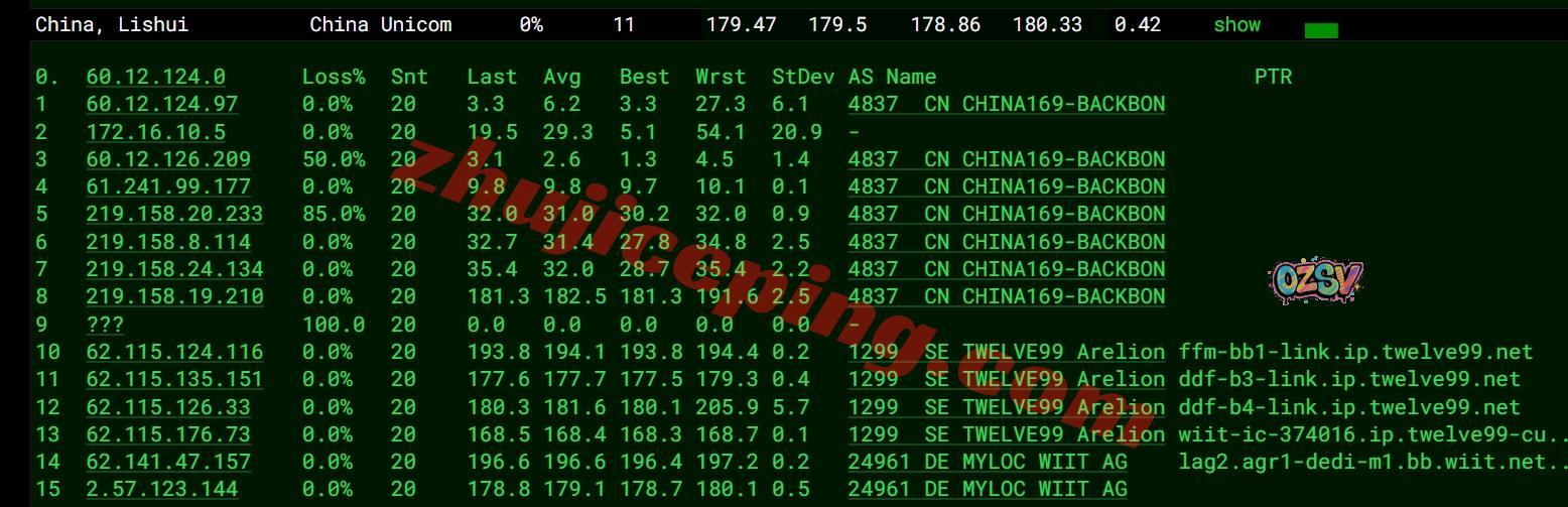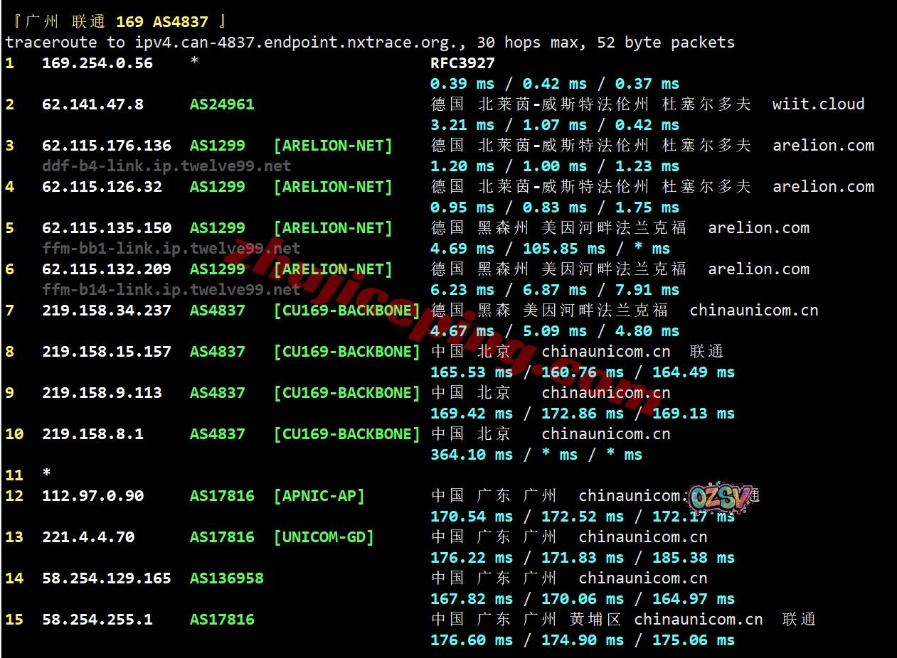广州方向:WIIT接telia从联通法兰克福节点出海直连回国