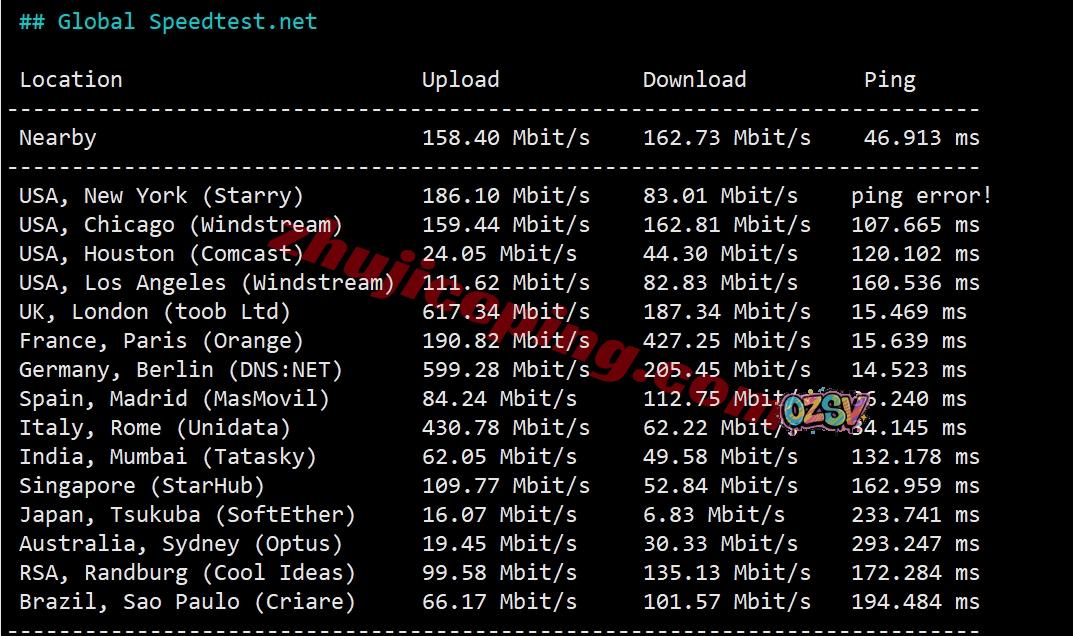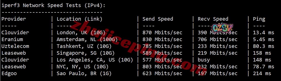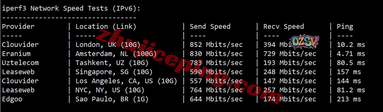 还是iperf3测试,几个热门国际节点,在IPv6环境下测试,效果如下: