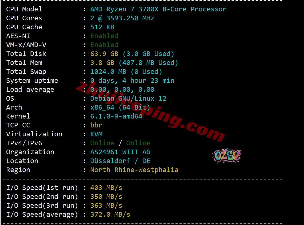 服务器用的CPU型号为AMD Ryzen 7 3700X(8核、16线程、3.6GHz主频、4.4GHz加速频率),启用了BBR,归属地德国,当前I/O大致372MB/S: