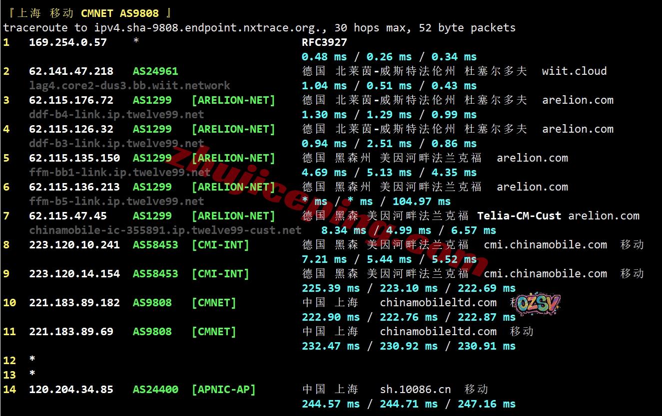 上海方向:走WIIT接telia到法兰克福,从telia与移动的peer出来接移动德国pop出海直连回国