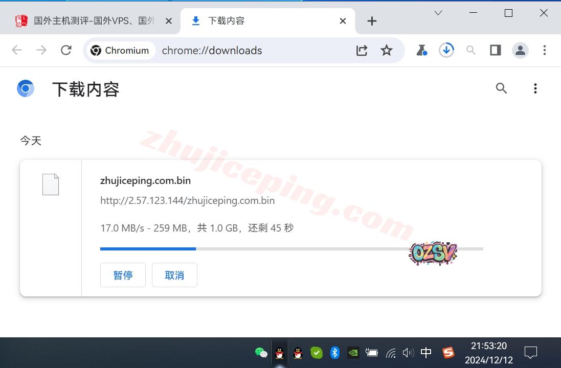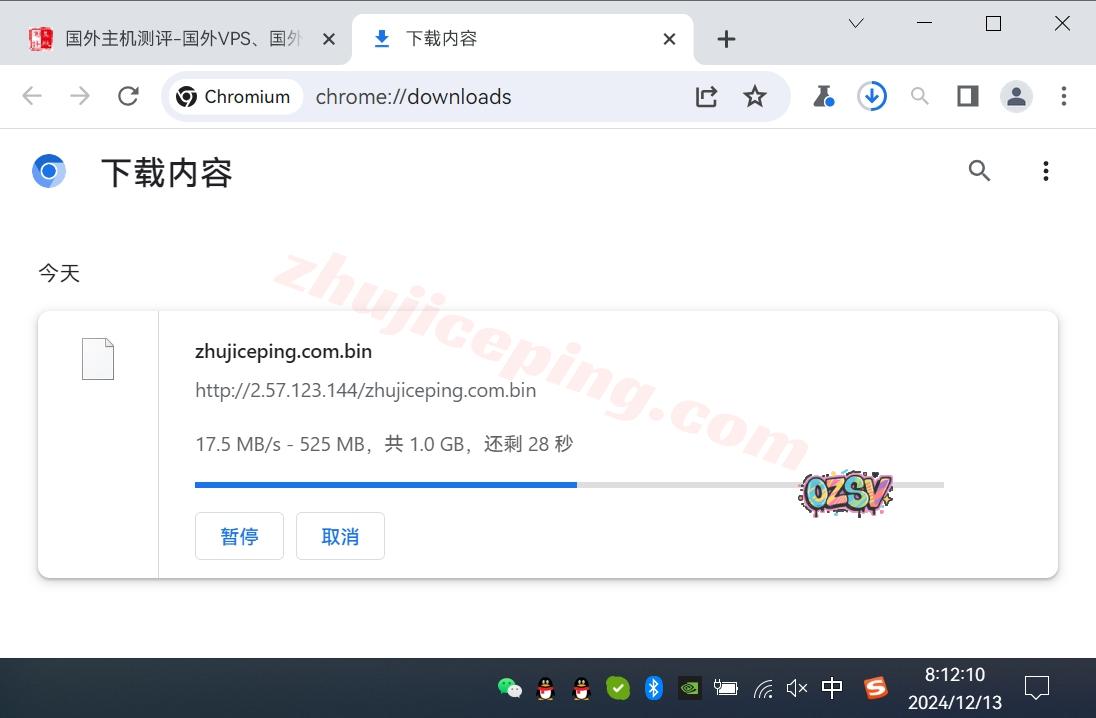 存放在测试VPS上的文件,广州联通家宽直接用Chrome下载该文件,大致的下载速度如下所示: