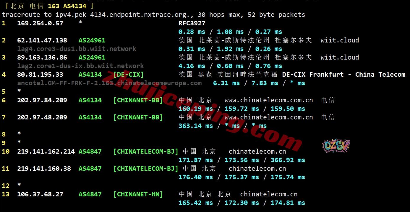 电信回程:从WIIT接DECIX与中国电信的peer出来直连回国