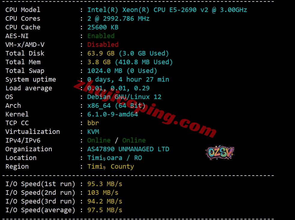服务器用的CPU型号为e5-2690v2(一般双路,20核、40线程、3.0GHz主频、3.6GHz加速频率),启用了BBR,支持IPv6,归属地罗马尼亚(蒂米什瓦拉),当前I/O大致97MB/S: