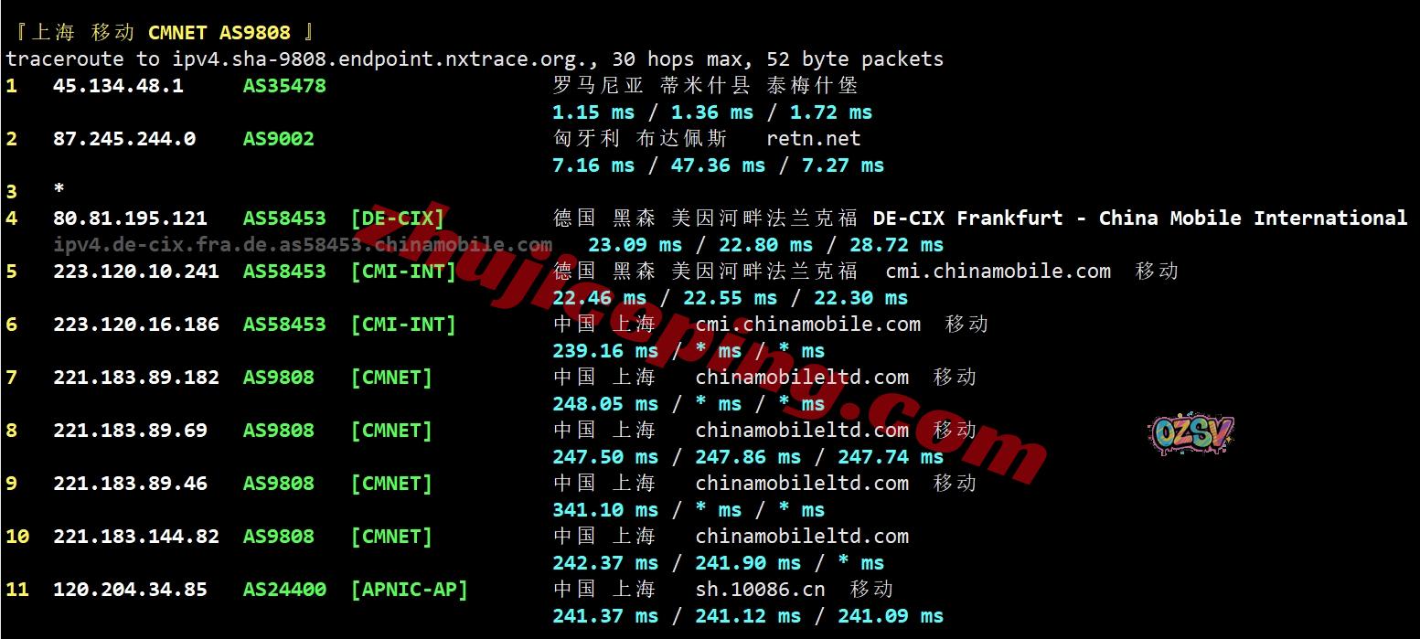 移动去程:直连移动德国法兰克福节点然后接retn去匈牙利、罗马尼亚