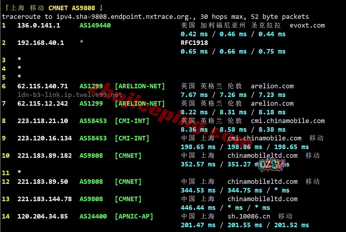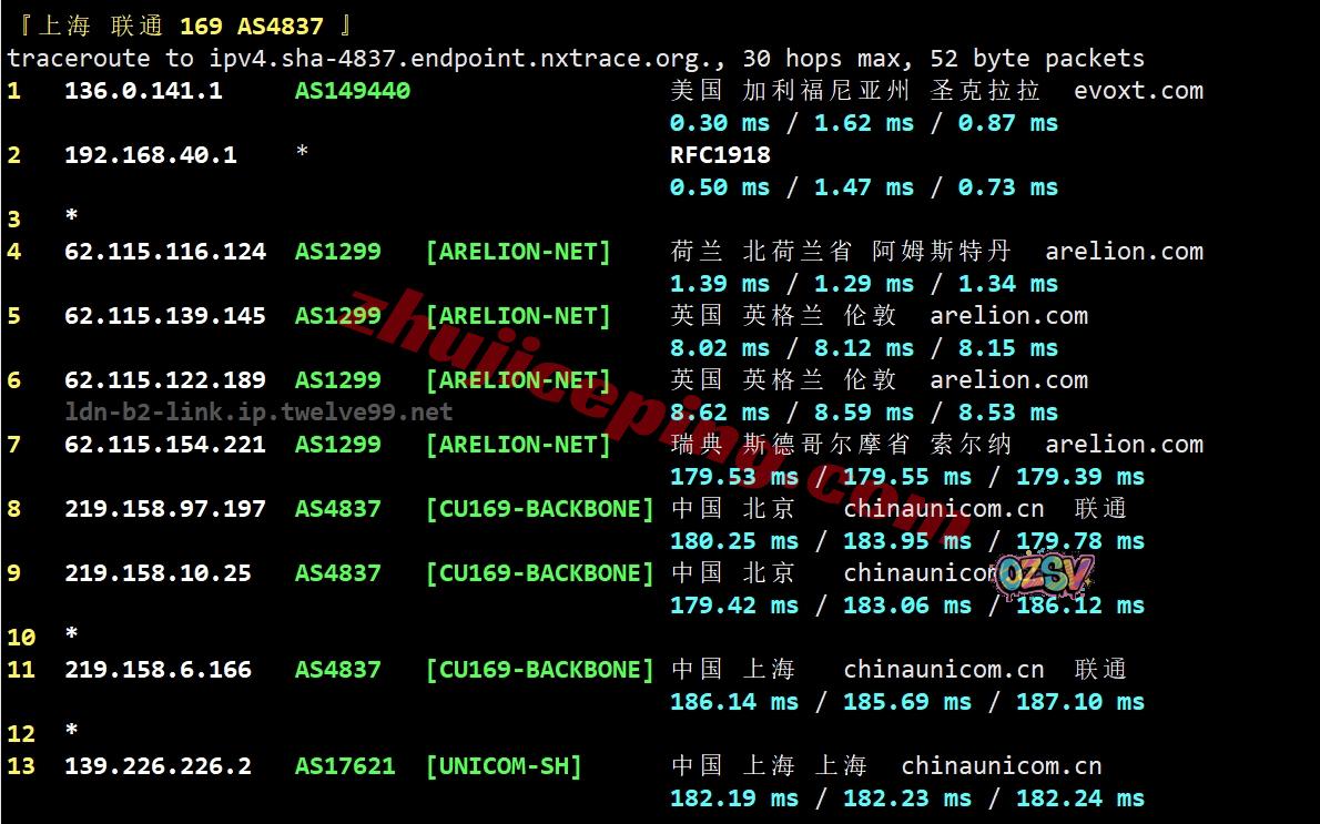 上海/广州方向:走telia到英国,从英国英国伦敦节点直连回国