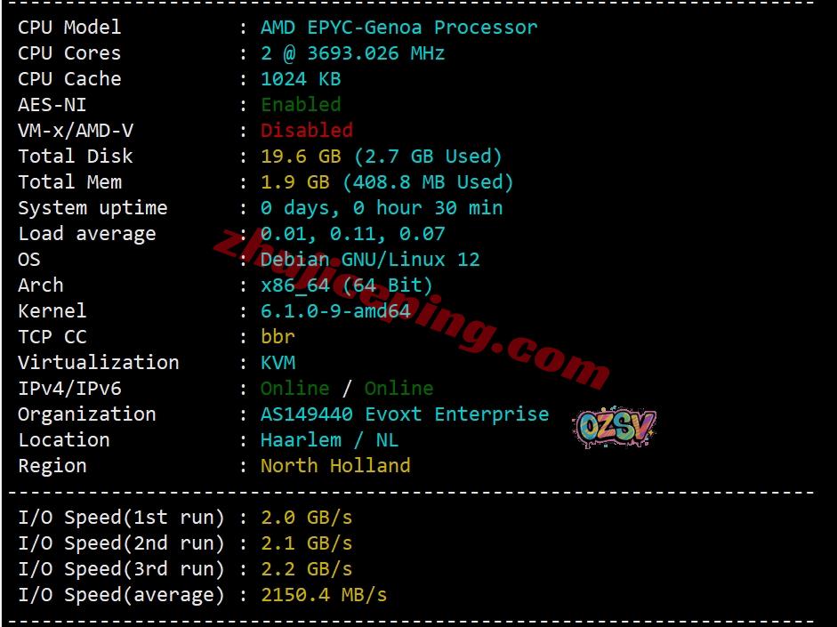 VPS服务器默认型号未知,但是CPU model显示的是AMD PEYC – Genoa(也就是第四代9004),主频 3693MHz,启用了BBR,支持IPv6,归属地确实在荷兰,当前I/O大致2150MB/S: