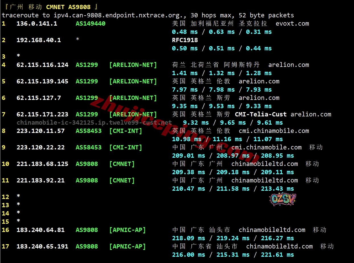 移动去程:直连移动英国伦敦节点然后接cogent去荷兰
