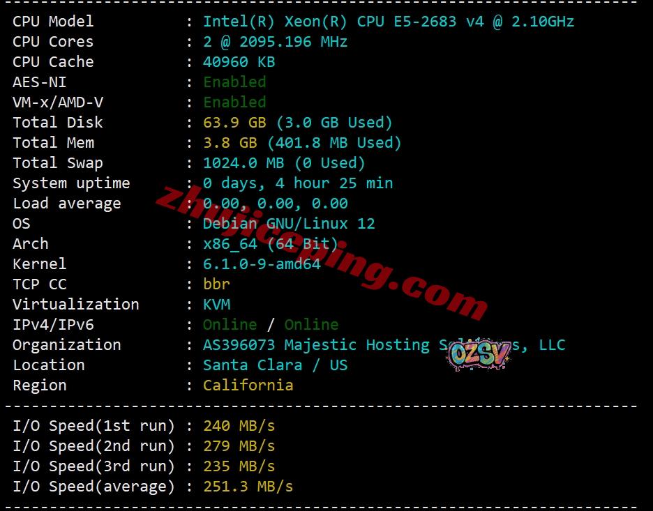 服务器用的CPU型号为e5-2683v4(绝大多数情况下都是双路,32核、64线程、主频2.1GHz、加速频率3.0GHz),站长启用了BBR,支持IPv6,上游网络由majestic提供,归属地加州(圣克拉拉),当前I/O大致251MB/S: