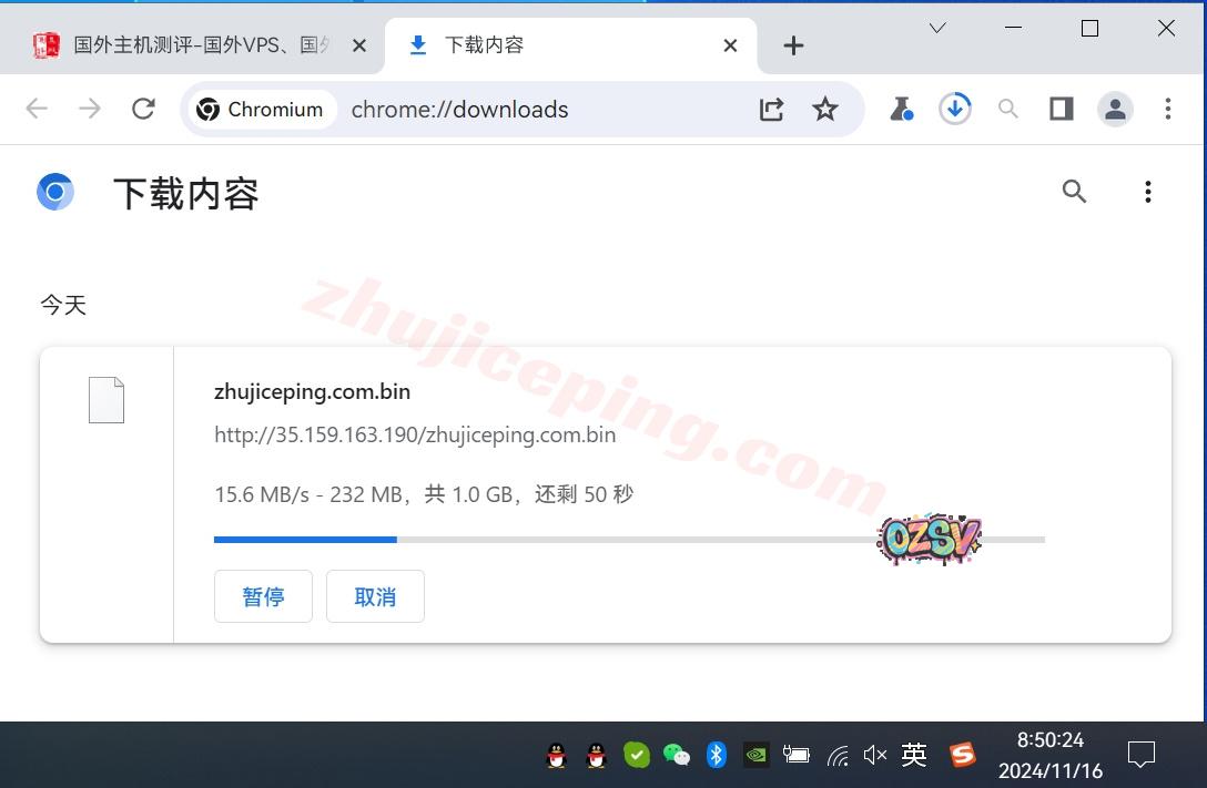 存放在测试云服务器上的文件,广州联通家宽直接用Chrome下载该文件,大致的下载速度如下所示: