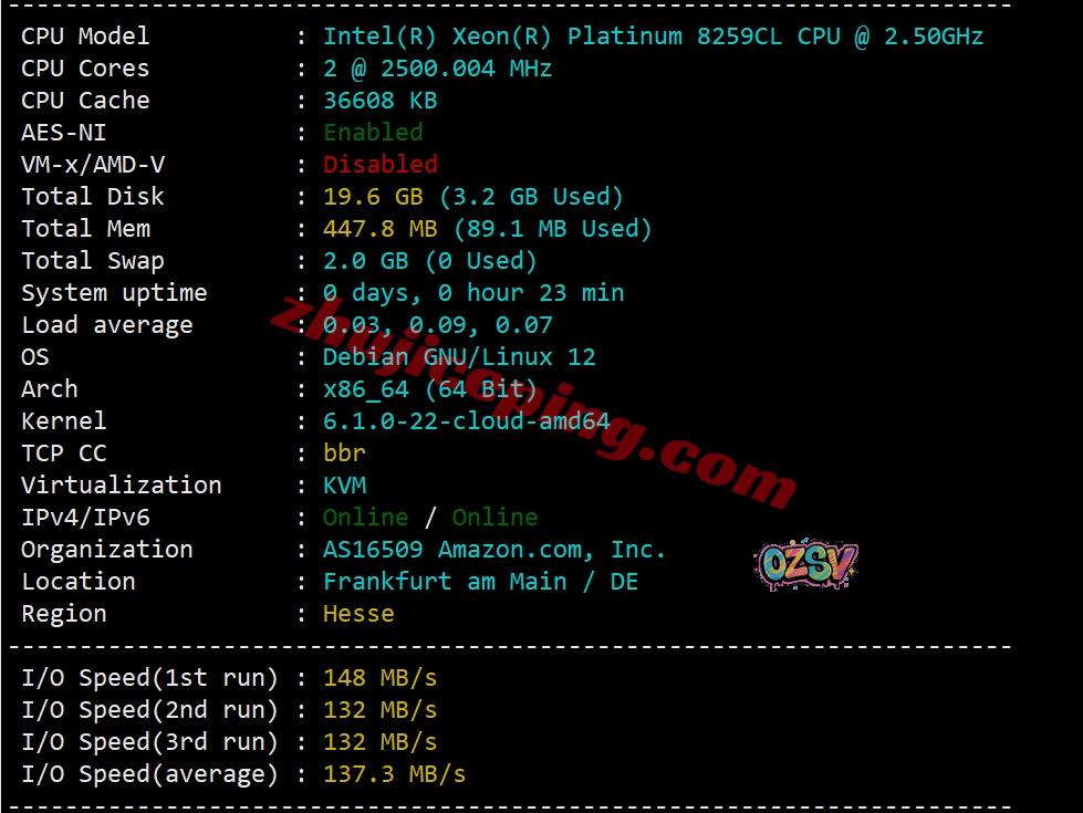 本次测试的机型用的是Intel Xeon Platinum 8259CL(24核、48线程、主频2.5GHz、加速频率3.5GHz)、站长启用了BBR,默认支持IPv6,亚马逊自己的网络,归属地德国,当前I/O大致在137MB/S的样子: