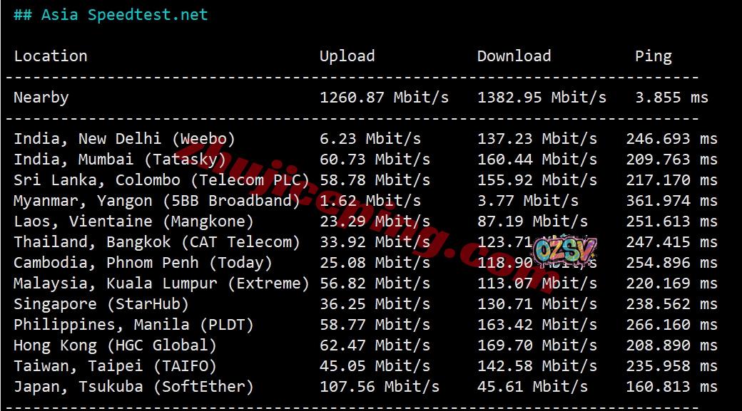 SpeedTest.Net的部分亚洲区域内的节点的带宽上下行测试数据: