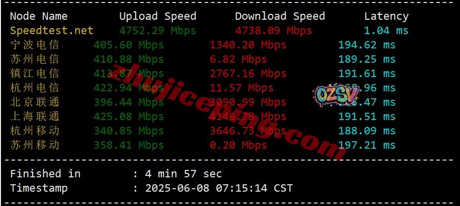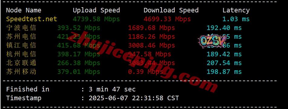 国内三网多节点的带宽上下行测试数据如下所示(上行最高425Mbps):