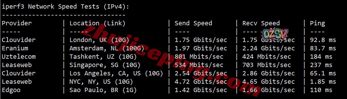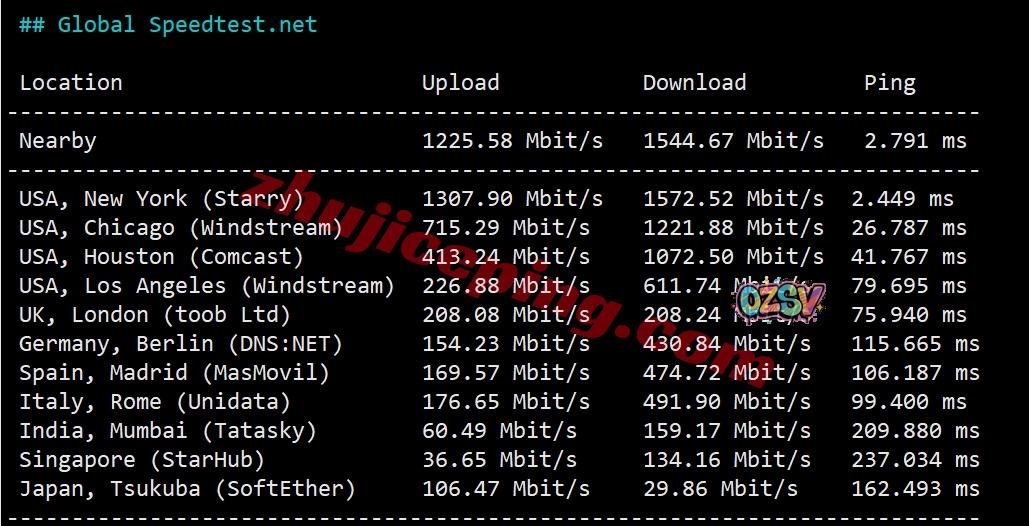 SpeedTest.Net的部分国际节点的带宽上下行测试数据:
