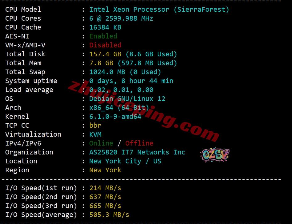 服务器的CPU型号未知,主频2.6GHz,系统默认启用了BBR,不支持IPv6,搬瓦工自己的网络,归属地美国纽约,当前I/测试数据大致在505MB/S: