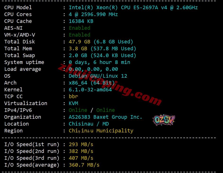 服务器用的CPU型号为e5-2697A v4(一般是双路,32核、64线程、主频2.6GHz、加速频率3.6GHz),站长启用了BBR,支持IPv6,justhost自己的AS,归属地摩尔多瓦,当前I/O大致360MB/S: