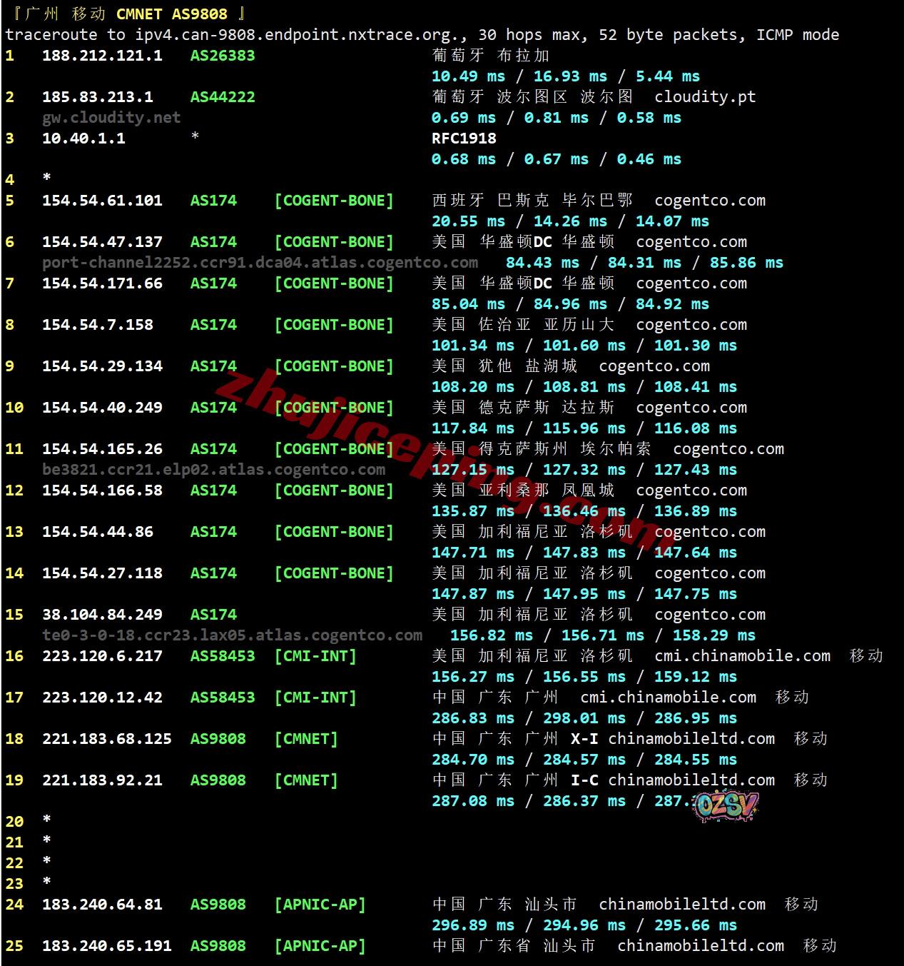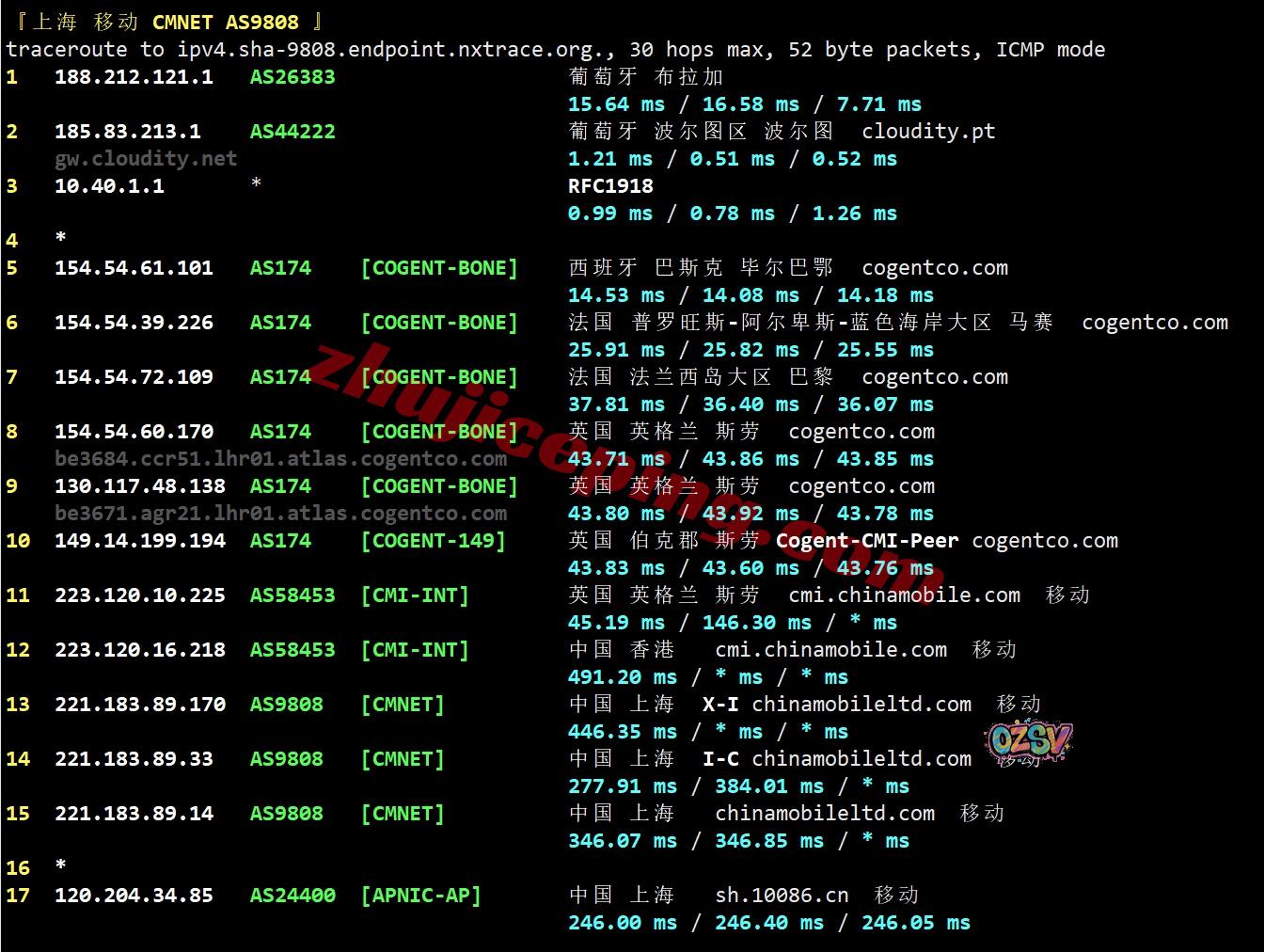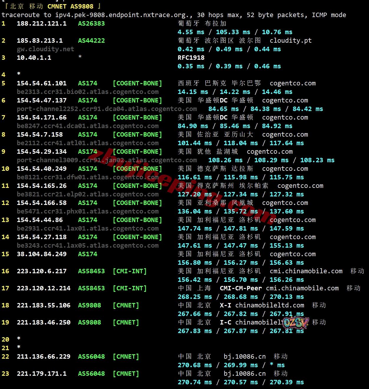 移动去程:直连移动英国伦敦节点然后接cogent经过法国、西班牙到葡萄牙
