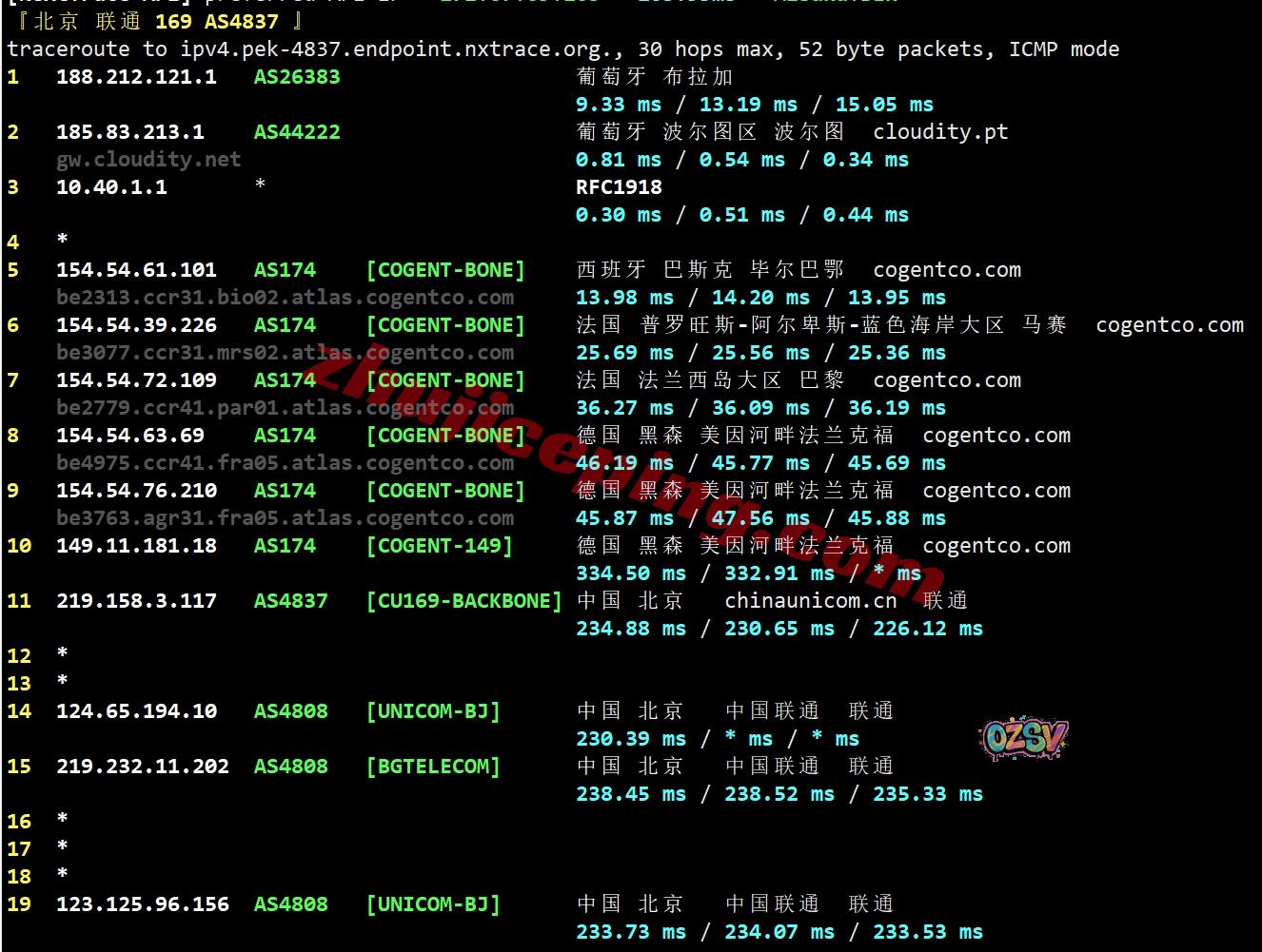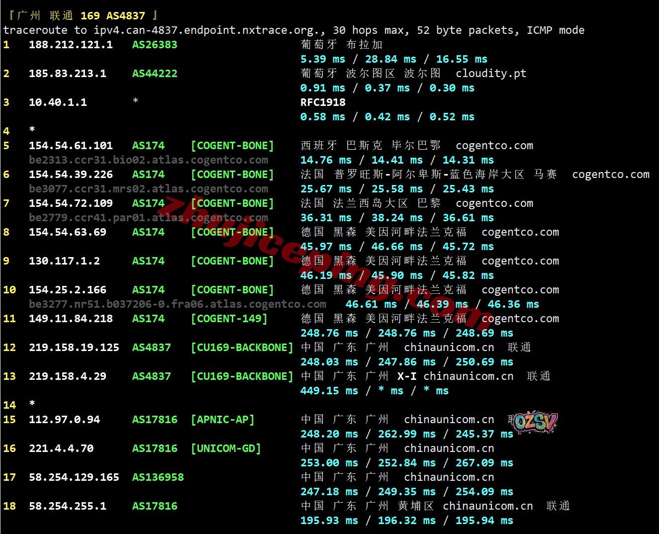 联通回程:机房对接cogent经过西班牙、法国、德国然后去中国大陆