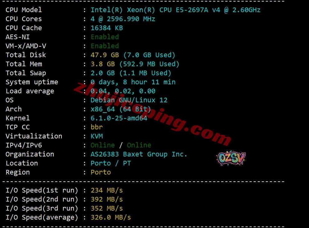 一如以往,服务器的CPU为e5-2697A v4(一般是双路,32核、64线程、主频2.6GHz、加速频率3.6GHz),启用BBR,支持IPv6,justhost自己的AS,归属地葡萄牙波尔图,当前I/O大致326MB/S: