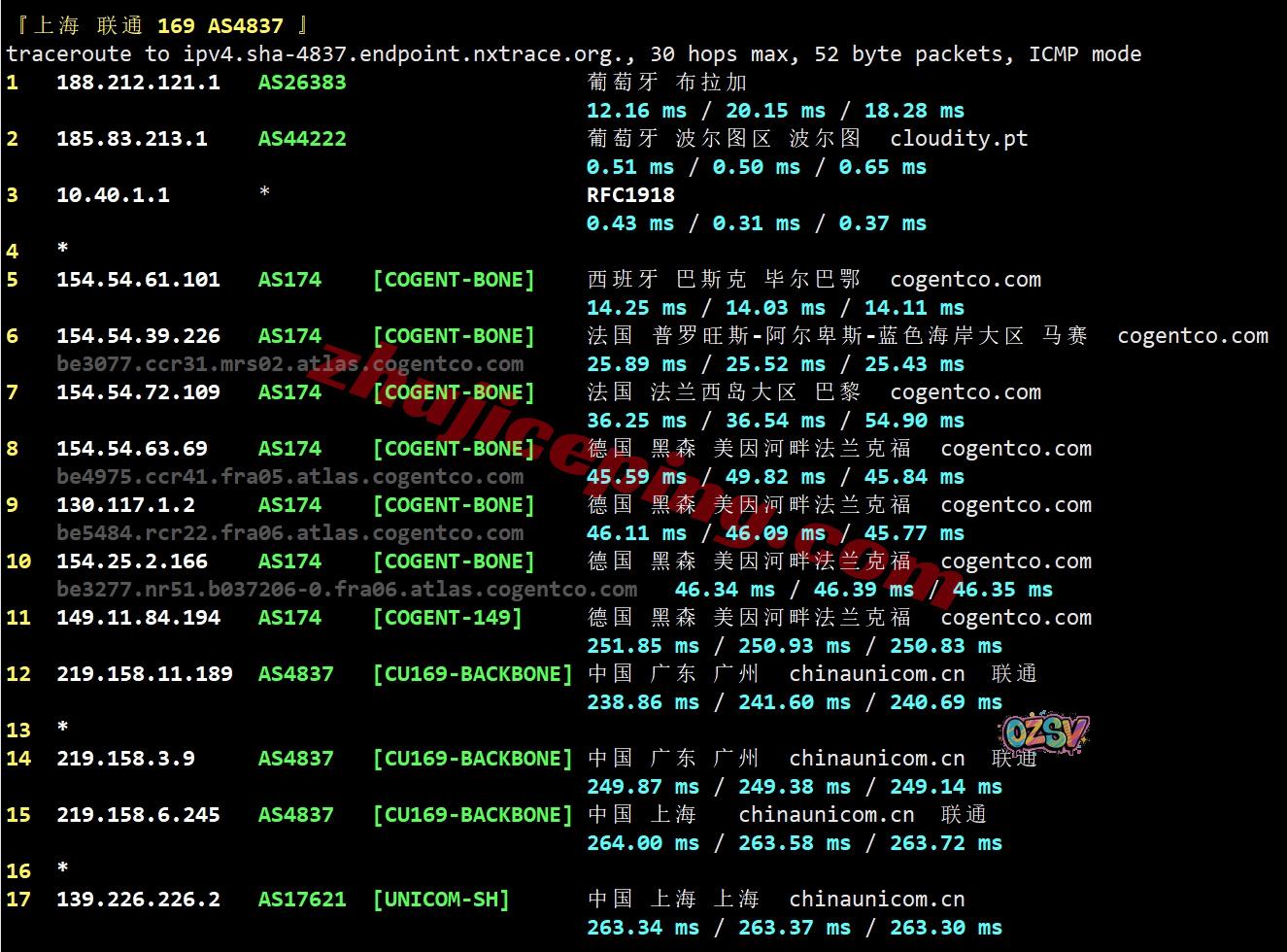 上海方向:走cogent经过西班牙、法国、英国,从英格兰移动CMI节点直连回香港然后回内地
