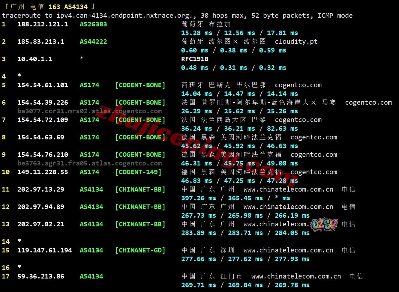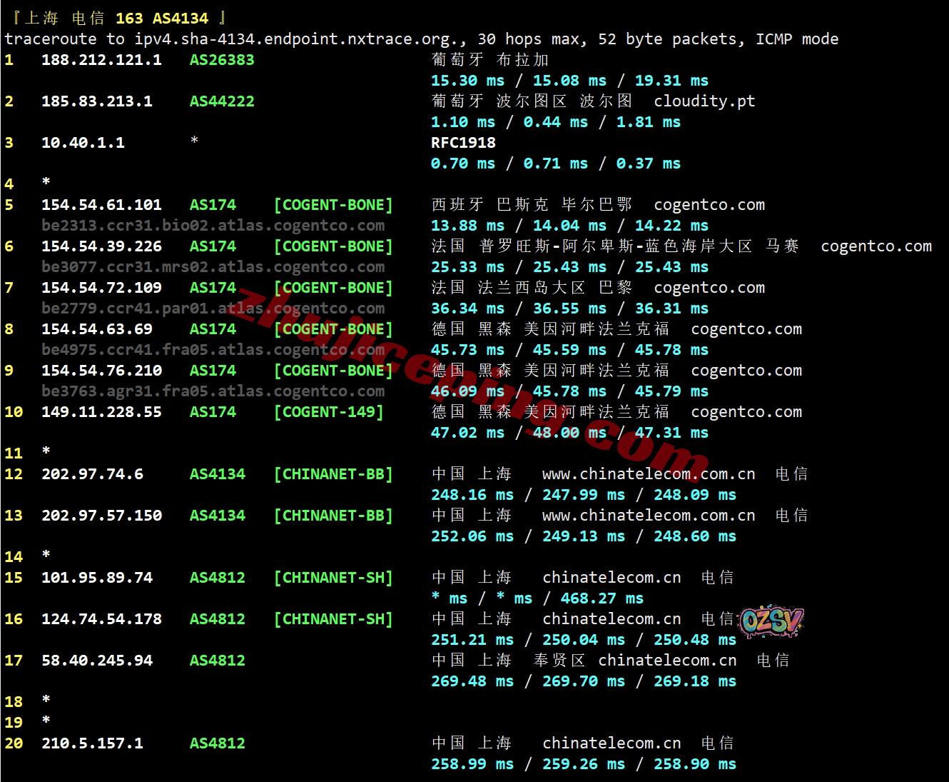 电信回程:机房对接cogent经过西班牙、法国、德国然后去中国大陆
