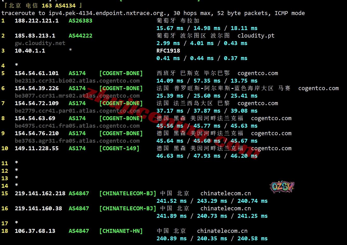 电信去程:直连电信美国圣何塞节点然后接cogent一路往东从弗吉尼亚出海直接去葡萄牙