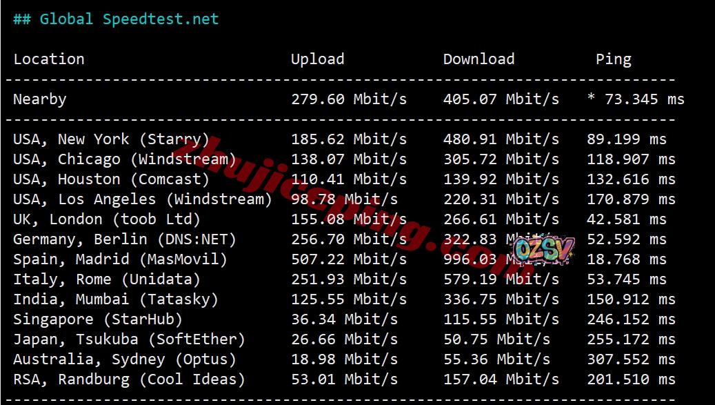 speedtest.Net提供的部分国际节点的带宽上下行测试数据: