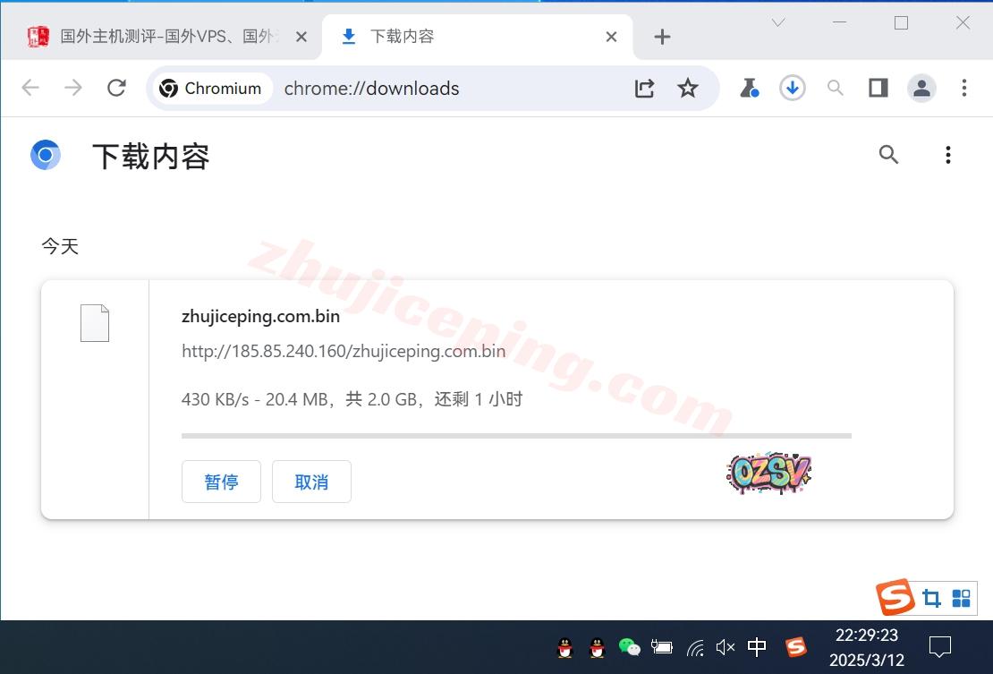 存放在测试VPS上的文件,广州联通家宽用Chrome下载该文件,大致的下载速度: