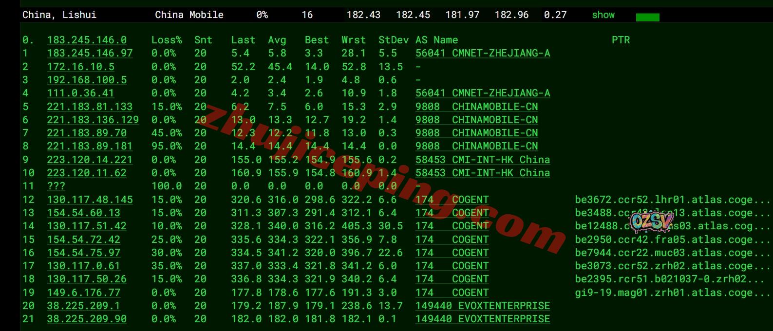 移动去程:直连移动英国伦敦节点,然后接cogent去荷兰、德国、瑞士