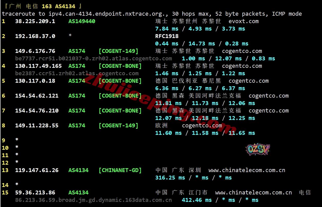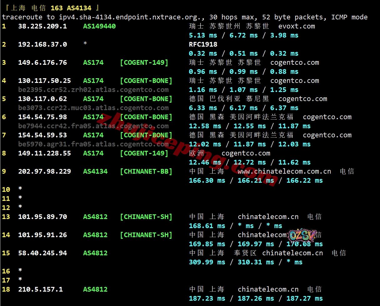 电信去程:直连电信德国法兰克福节点然后接cogent去瑞士