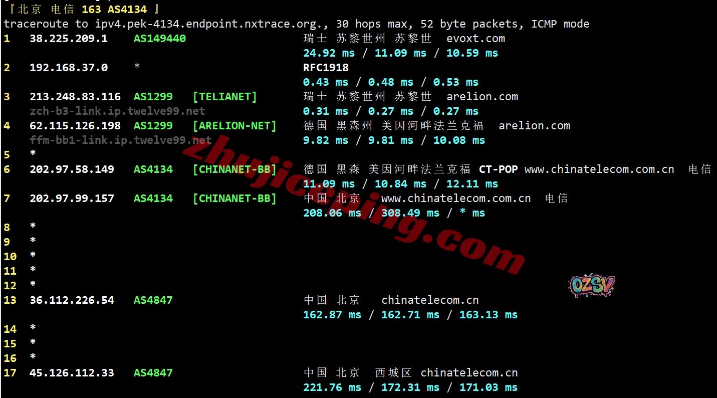 北京方向:走twelve99经过德国,从法兰克福电信pop直连回国