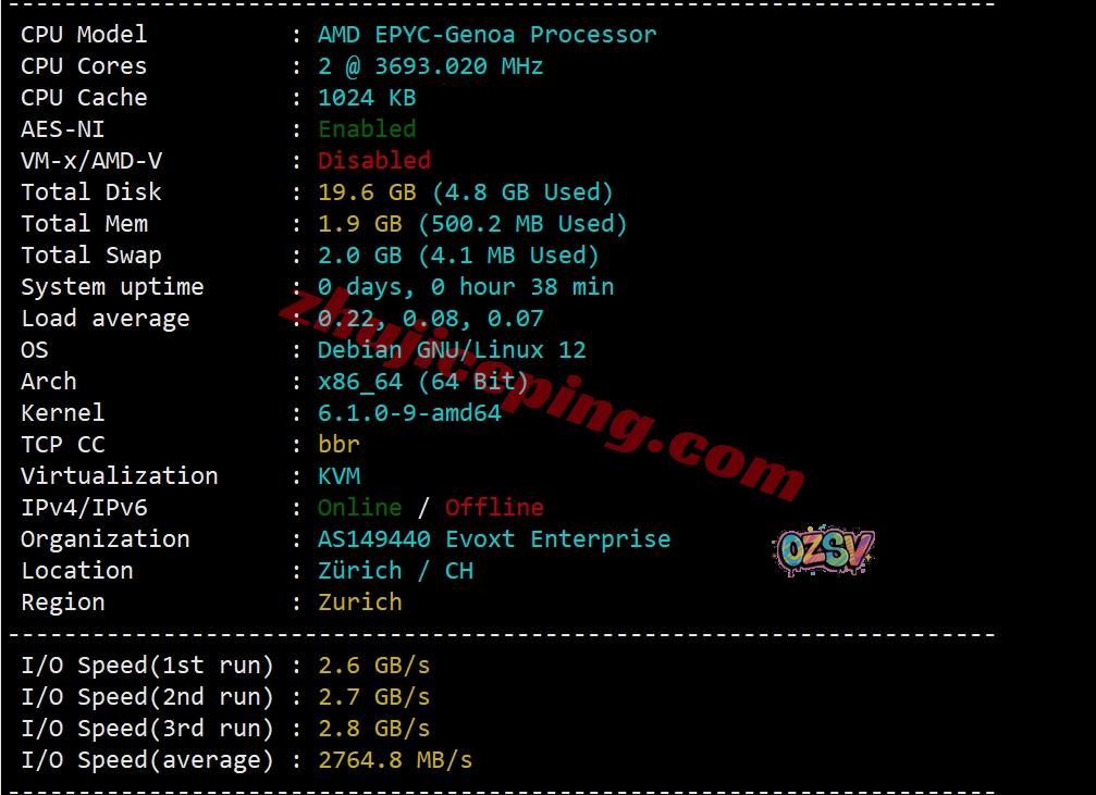 evoxt怎么样?evoxt瑞士vps怎么样?evoxt在瑞士苏黎世新增了VPS业务,依旧还是AMD高性能平台,而且还是10Gbps带宽,价格依旧还是2.99美元起步。由于数据中心在欧洲,虽然说瑞士那边对隐私和数据安全的保护要求很高,但是物理距离和国际线路这块儿都是比较让人担忧的(在没有高端线路加持的情况下)。所以,主机测评给大家先上了个详细的测评,是否适合你自己那就需要你自己判断了。