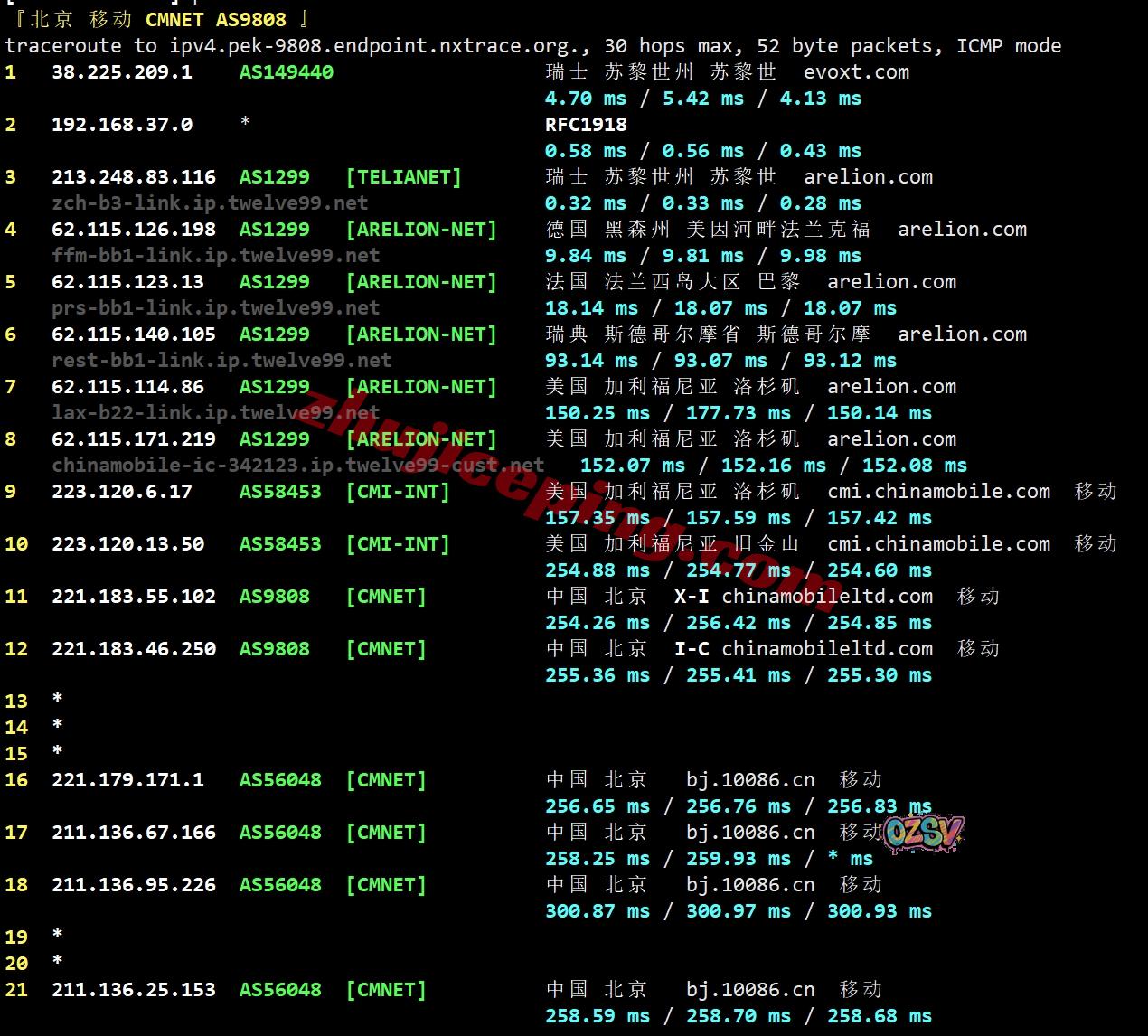 北京方向:走twelve99经过德国、法国、瑞典、美国洛杉矶,从移动洛杉矶节点到移动旧金山节点直连出海回国