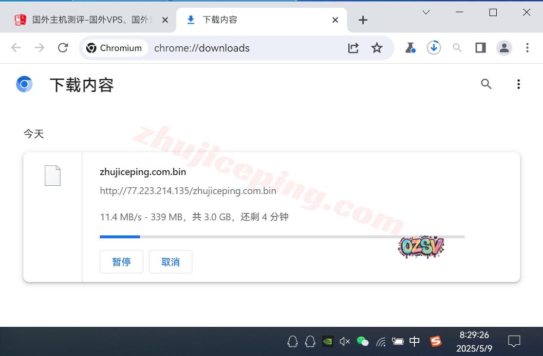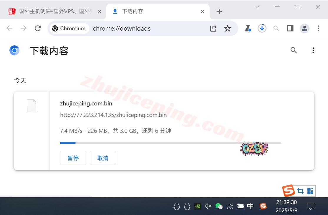 站长弄了个数据文件存放在测试用的VPS上,站长自己用的广州联通家宽网络,直接用Chrome来下载该文件,大致的速度如下: