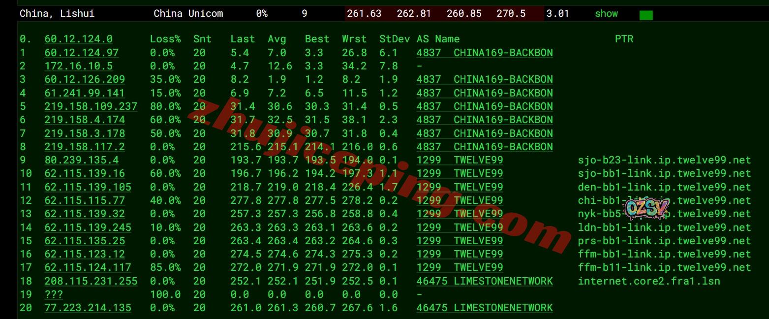联通去程:直连联通美国圣何塞节点然后接telia从美国东海岸纽约出海去英国、法国、德国